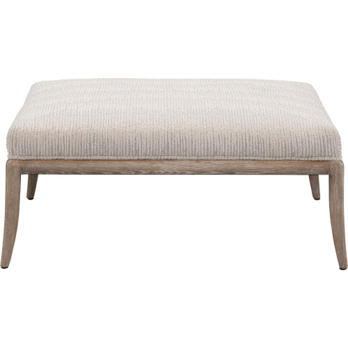The Sandswept Ottoman captures the serene beauty of layered beach sands while offering versatile, transitional style for any room. Upholstered in a textured modern stripe fabric, it adds subtle pattern and dimension that blends seamlessly into a variety of décor. Generously sized at 40"W x 40"D x 18"H, it works perfectly as a footrest or a chic coffee table when paired with a tray. Built with a natural gray oak base and legs, a poly dacron cushion, and webbed seat construction, this ottoman is both durable and comfortable. Its select hardwood frame with double-doweled, corner-blocked joints ensures lasting quality.