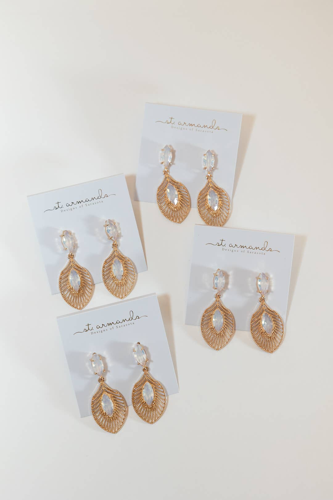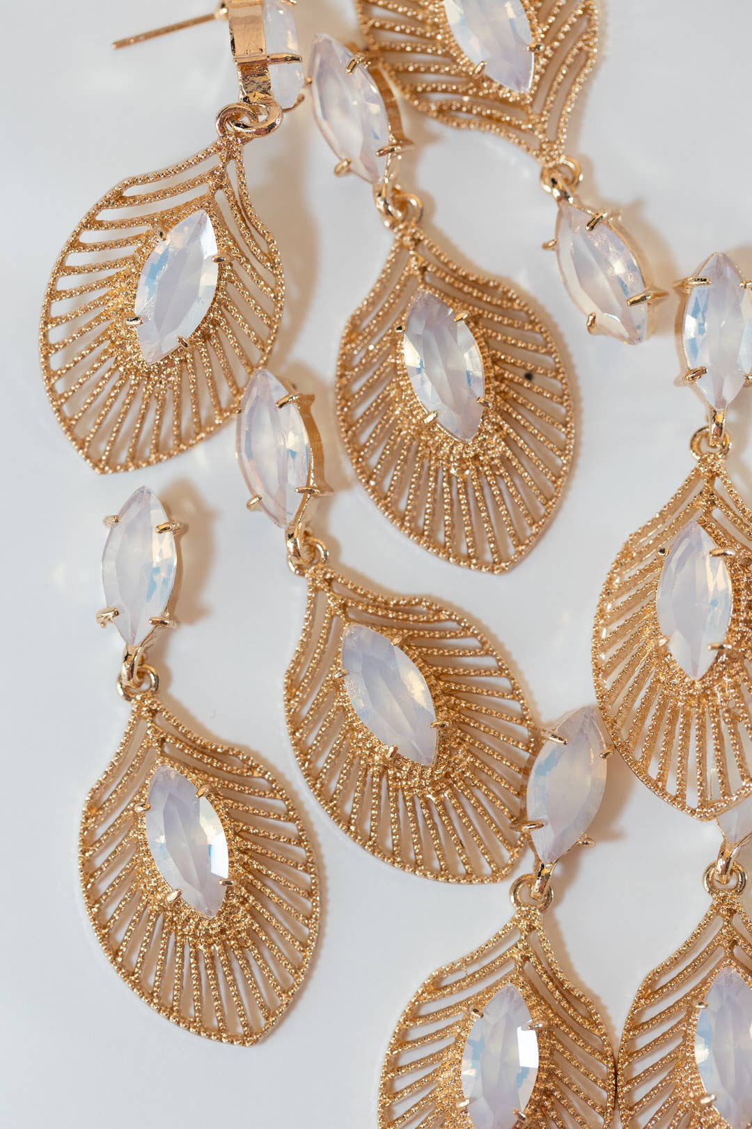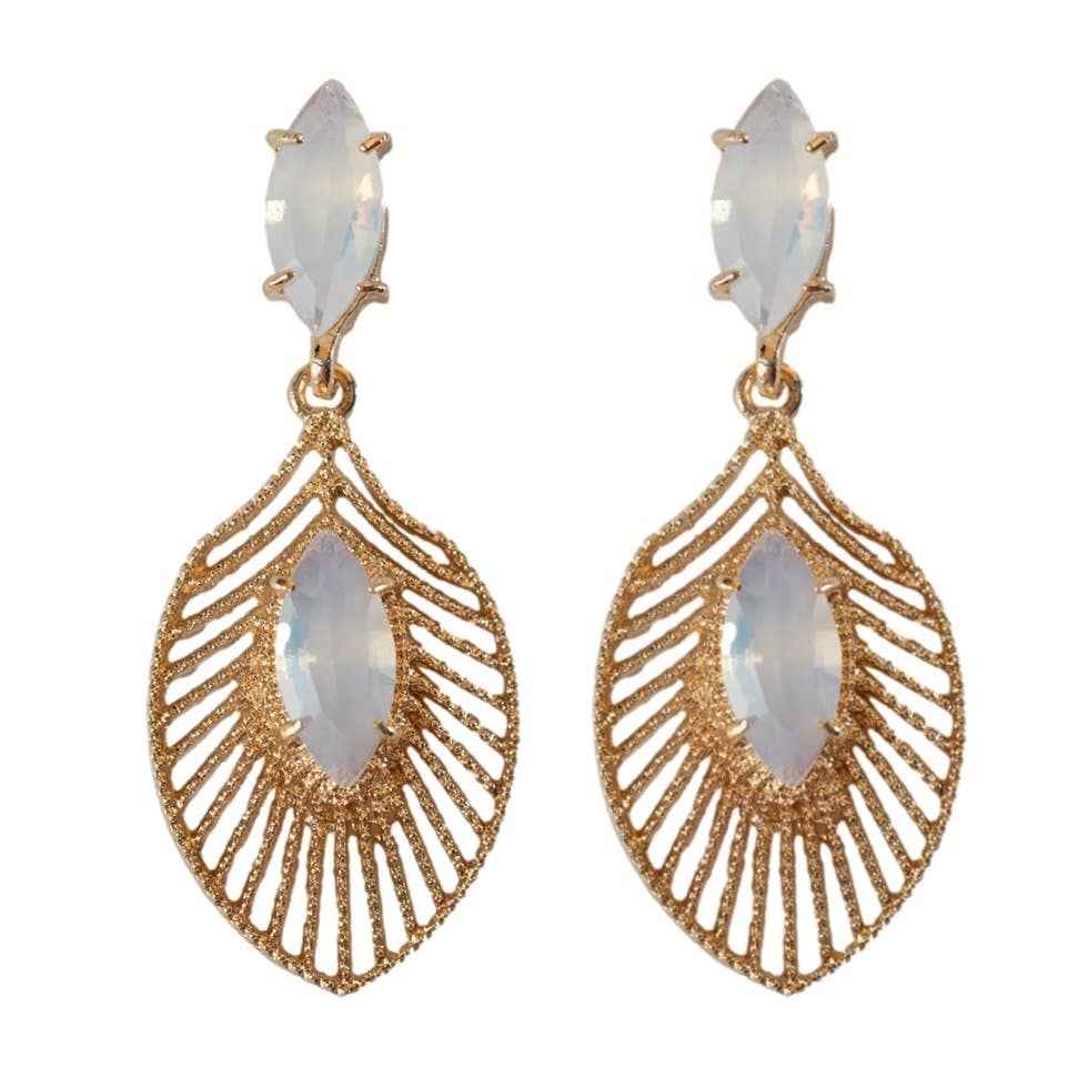 These stunning summer statement earrings feature a delicate palm frond design in rose gold-plated brass, with a luminous faux frosted quartz stone at the center. The soft, neutral stone complements the warm rose gold, creating an elegant tropical vibe. The durable stainless steel posts are hypoallergenic, making them ideal for sensitive ears.