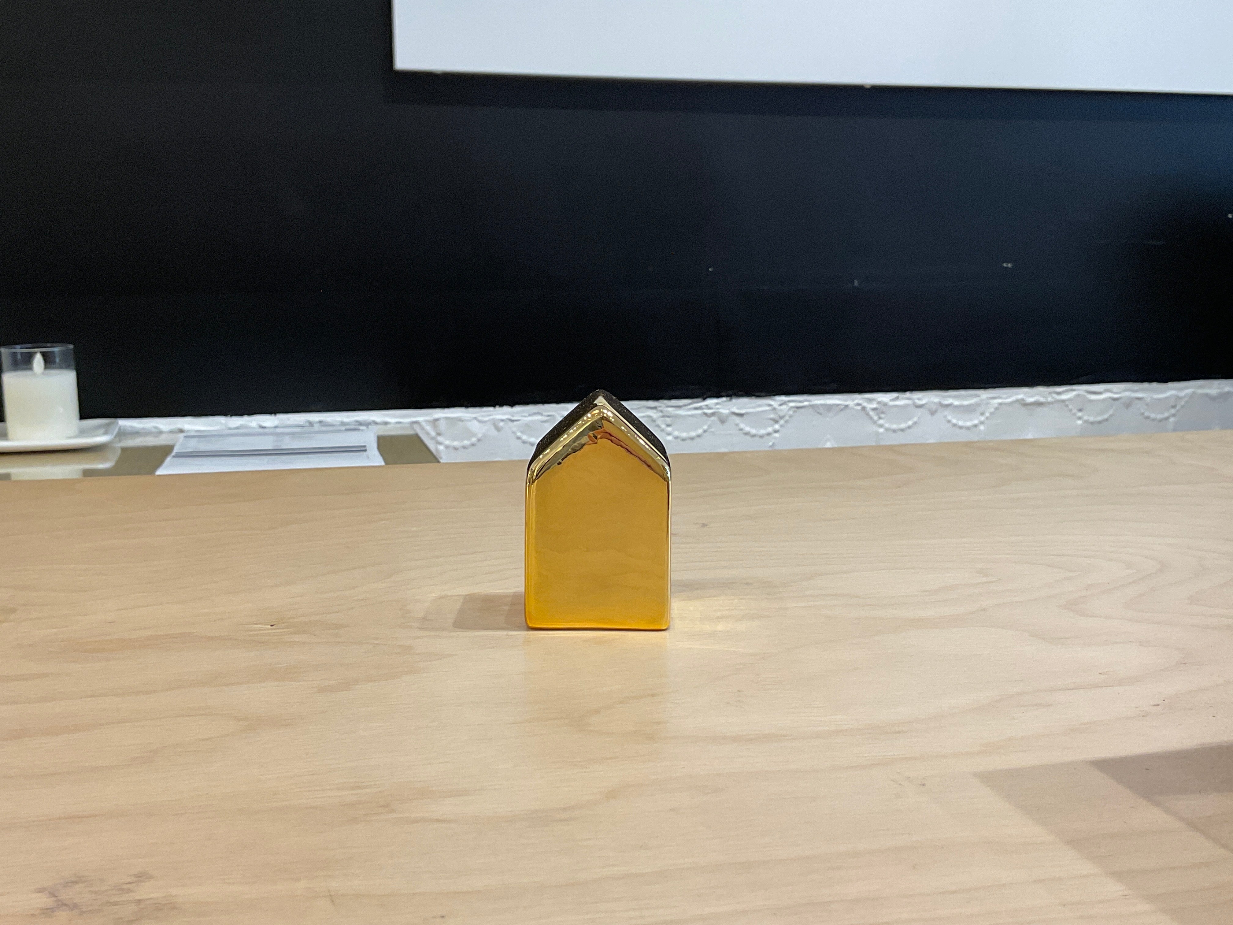 Small gold 3in ceramic house for use in holiday village.