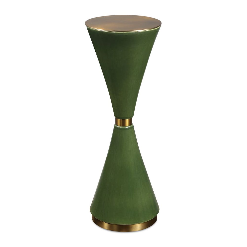 Sculptural and sophisticated, this striking ceramic drink table features a captivating hourglass silhouette finished in a rich jade green glaze. Brass-plated iron accents add a touch of modern elegance, making it a stunning statement piece beside a sofa, chair, or reading nook.