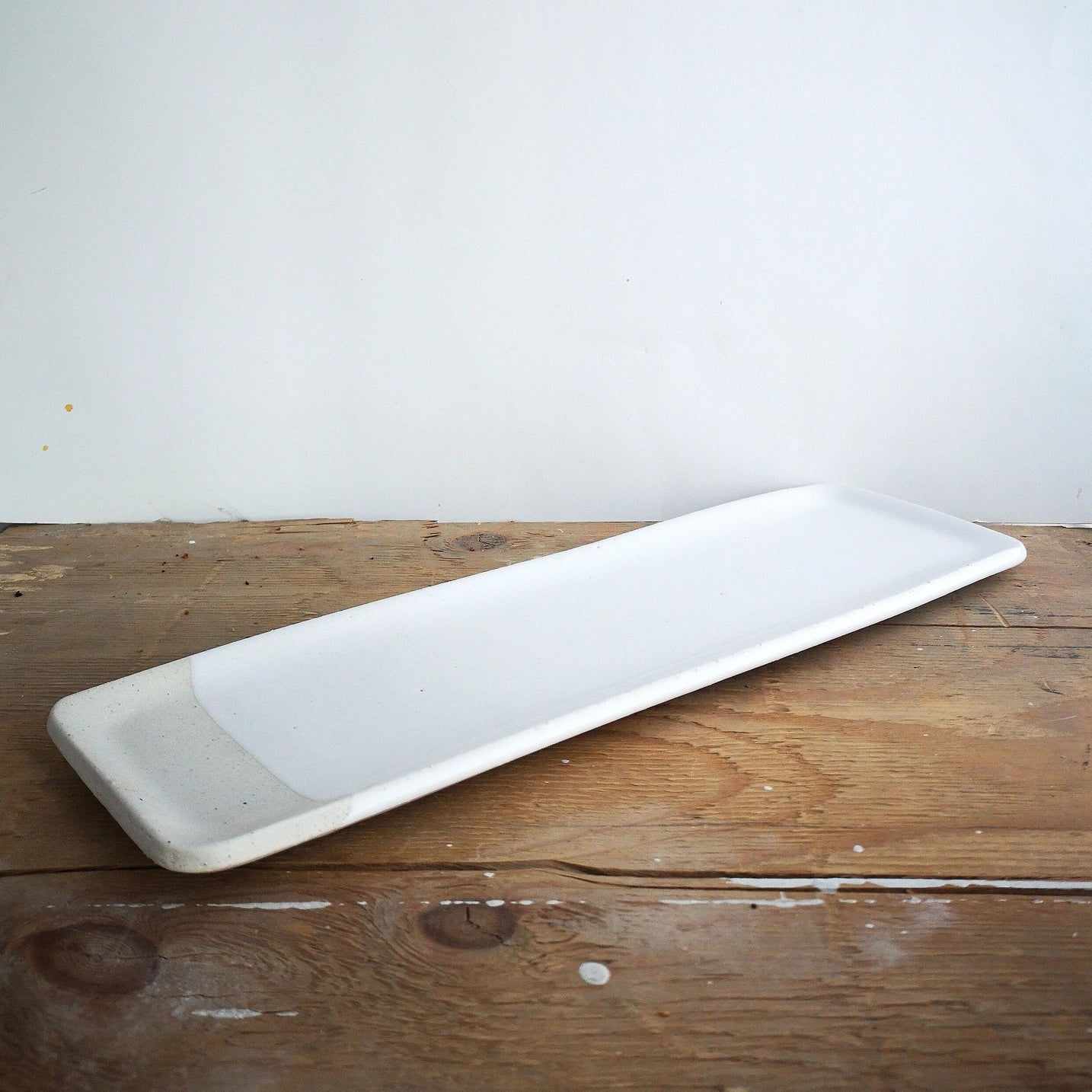 Elevate your table with this handmade rectangular platter from Atelier Tréma, a Canadian pottery studio known for its clean lines and timeless simplicity. Perfect for serving cakes, cheeses, or shared appetizers, each platter is wheel-thrown and partially glazed, revealing the raw clay beneath for a modern yet rustic look.
