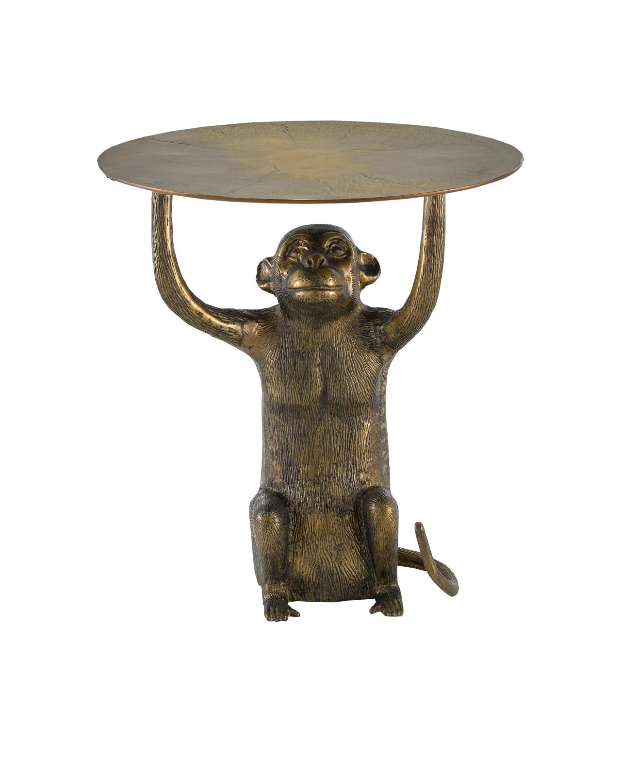 Add a touch of playful sophistication to your space with the Brass Monkey Accent Table. Crafted from solid cast aluminum, this eye-catching design features a whimsical monkey effortlessly holding up the tabletop — a perfect blend of art, humor, and function. The antique brass finish gives it a warm, vintage-inspired glow, while subtle creases in the tabletop add texture and character. Whether placed beside a sofa, reading chair, or in a cozy nook, this table brings personality and timeless charm to any room.